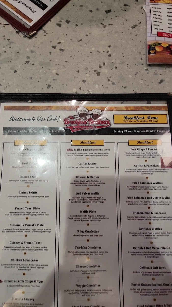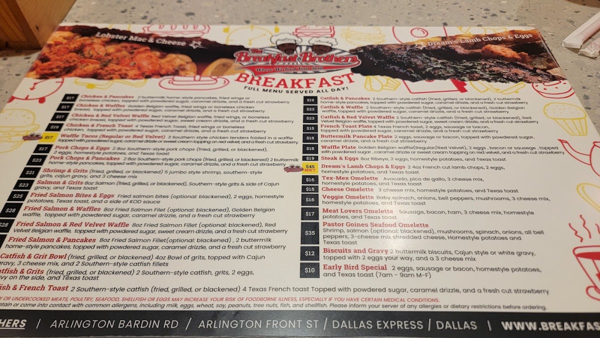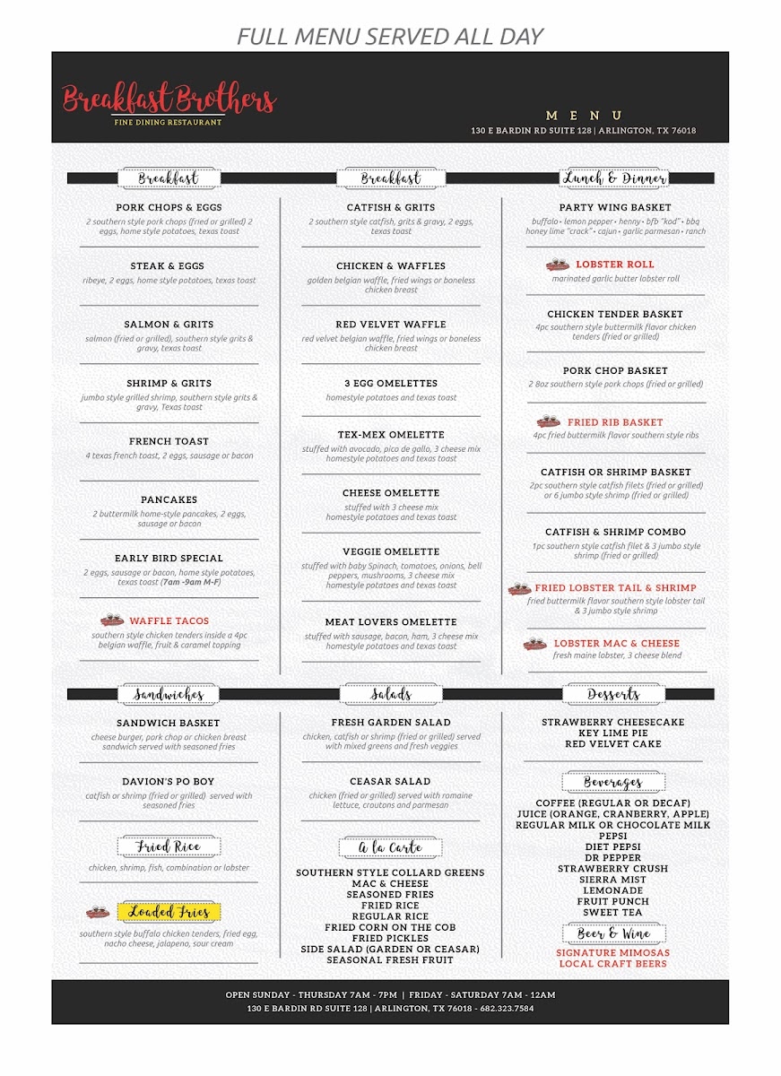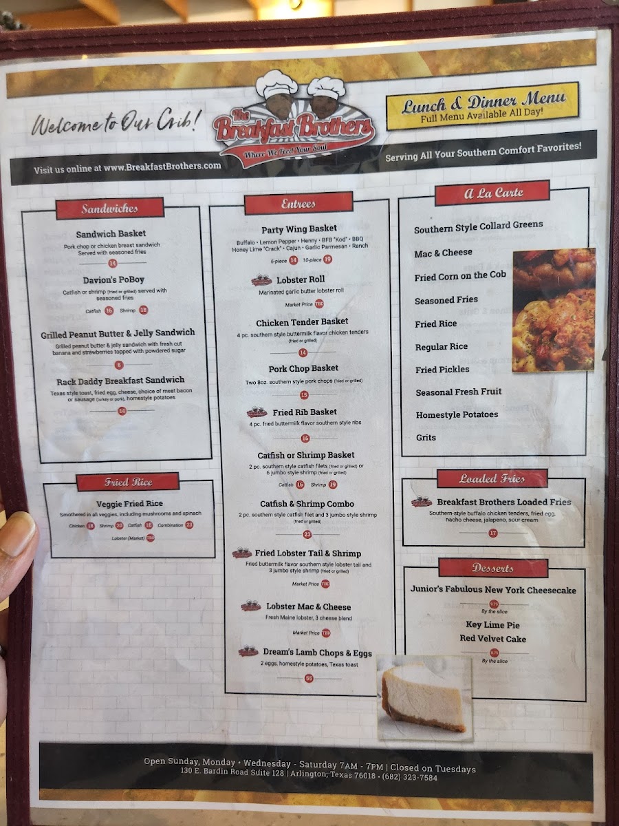 If you’re craving a breakfast that actually feels worth getting out of bed for, the Breakfast Brothers Menu at 130 E Bardin Rd STE 128 in Arlington, TX is where the magic starts. The lineup leans big and bold, with plates stacked high and flavors that don’t hold back. Think fluffy pancakes dripping with syrup, golden waffles with the perfect crisp, and chicken and waffles that hit that sweet-and-savory sweet spot just right.